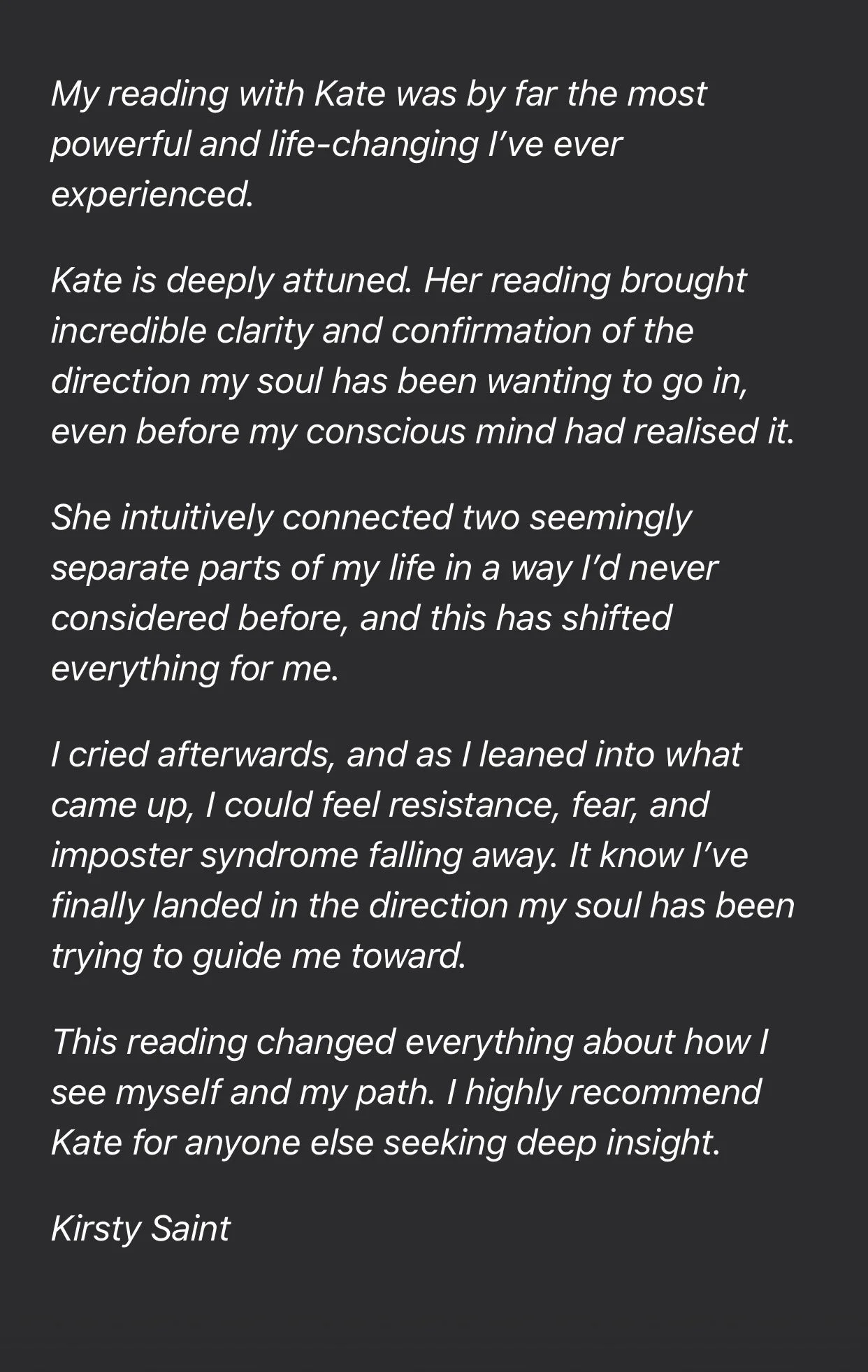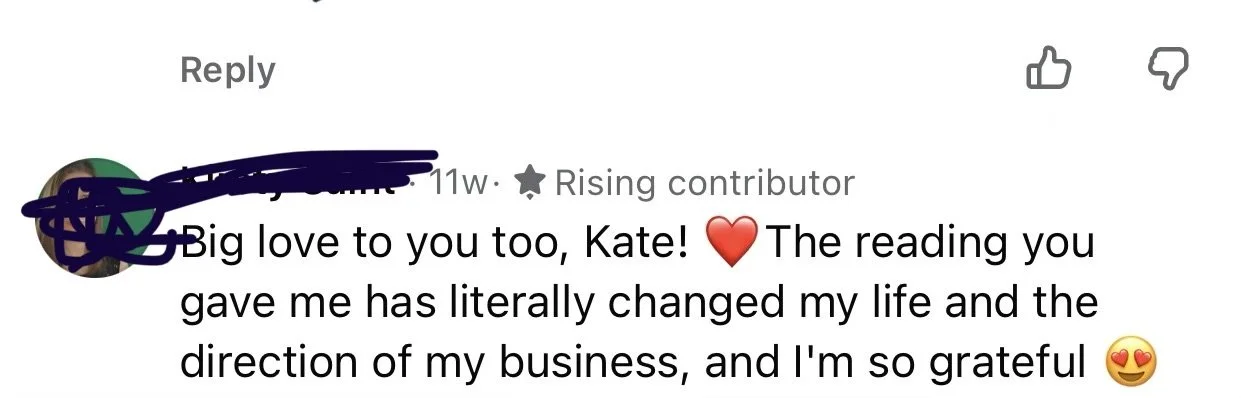 All of my readings—whether 20 minute pre-recorded mini readings, my LIVE 1 to 1 readings, or my signature Align & Elevate with Kate Business Transformation packages, they all go to the root of your questions. They are laser-focused and transformative.